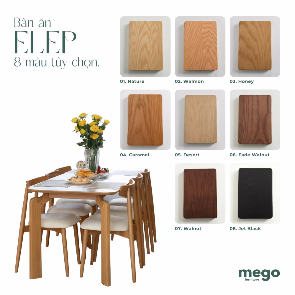 - Bàn ăn ELEP có thiết kế tối giản và tinh tế. Điểm độc đáo nằm ở phần chân bàn. Điều này tạo nét đặc biệt cho không gian bếp của bạn.