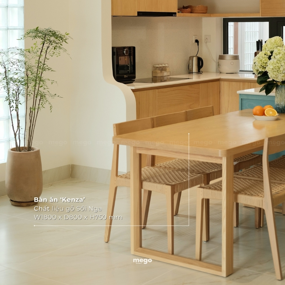 - Bàn ăn KENZA được thiết kế tối giản, tinh gọn, phù hợp với nhiều không gian, phong cách khác nhau từ Japandi, Scandinavian, Minimalism,...