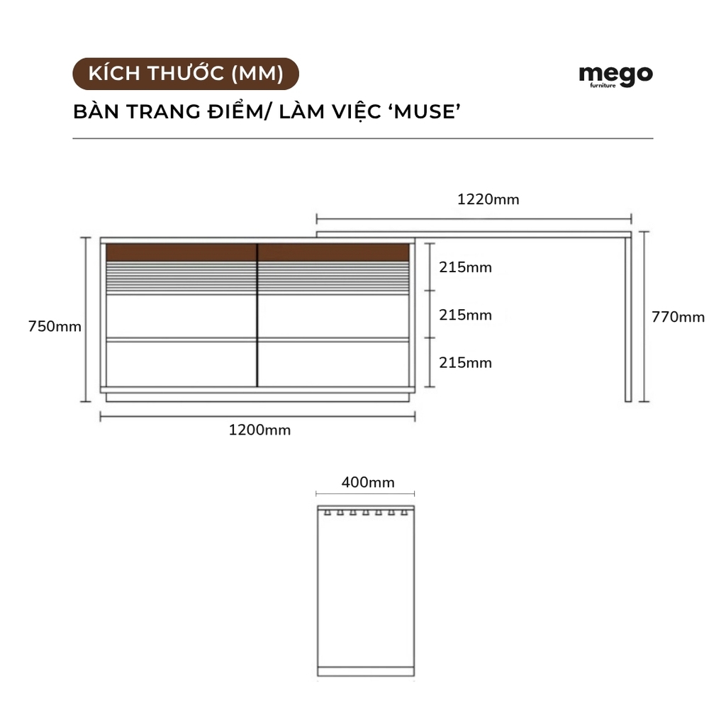 - Tủ trang điểm, lưu trữ: R1200 x S400 x C750mm