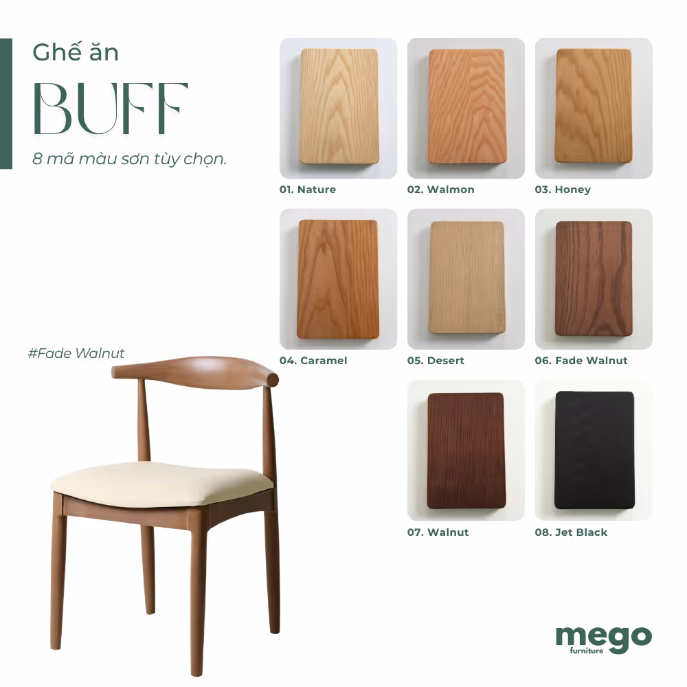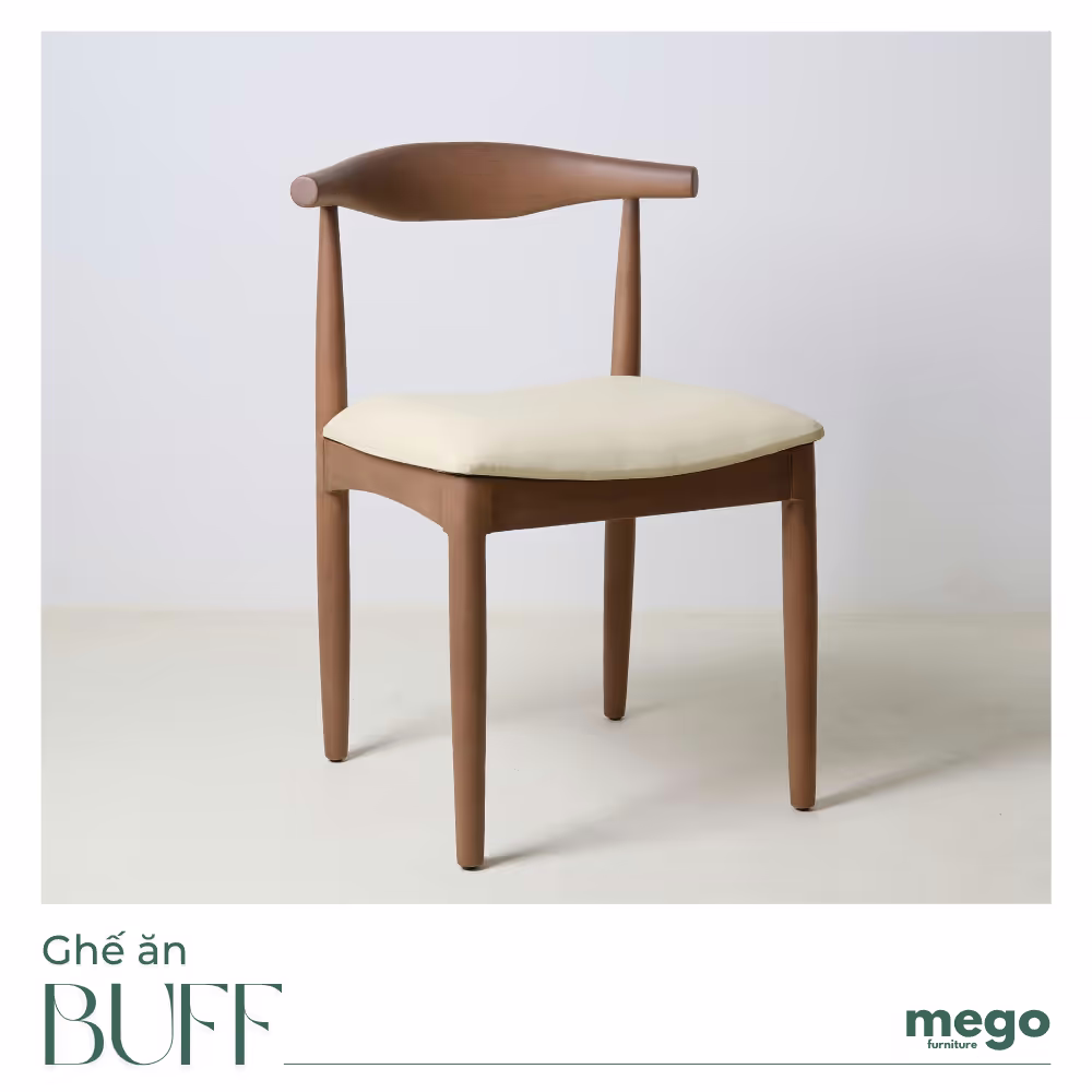 - Ghế ăn BUFF với thiết kế tối giản, phù hợp mọi không gian từ nhà ở cho đến các không gian F&B hiện nay. Đặc biệt, ghế được thiết kế phù hợp với dáng người của người Việt Nam, mang lại cảm giác ngồi đúng, thoải mái.