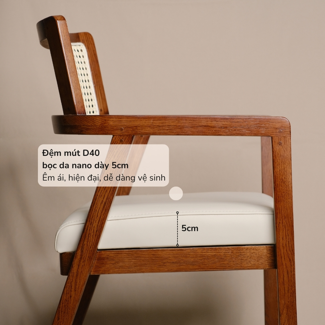 - Đệm ngồi mút D40 bọc da nano, êm ái, mềm mại và dễ dàng vệ sinh. Mặt ngồi rộng rãi, thoải mái kể cả khi ngồi lâu.