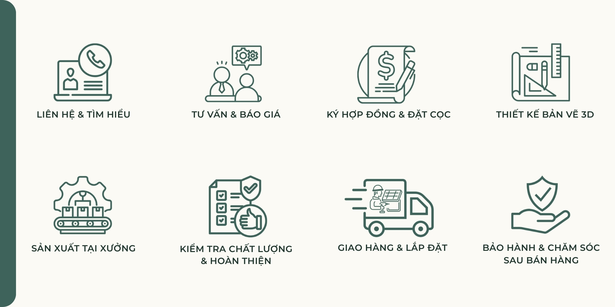4. Quy trình & Chính sách rõ ràng: QUY TRÌNH 8 BƯỚC TẠI NỘI THẤT MEGO: Từ tư vấn, thiết kế, sản xuất đến lắp đặt, mọi công đoạn đều minh bạch và chuyên nghiệp.