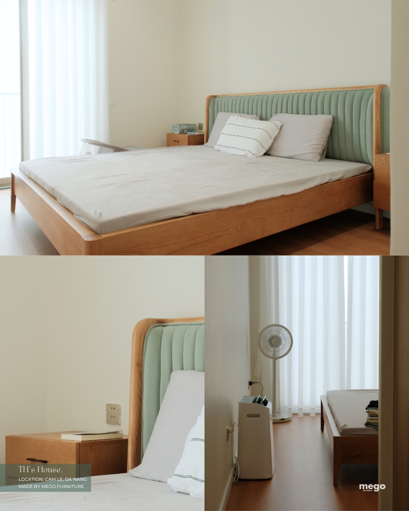Giường ngủ: gỗ Sồi tự nhiên chắc chắn, kiểu dáng tối giản.