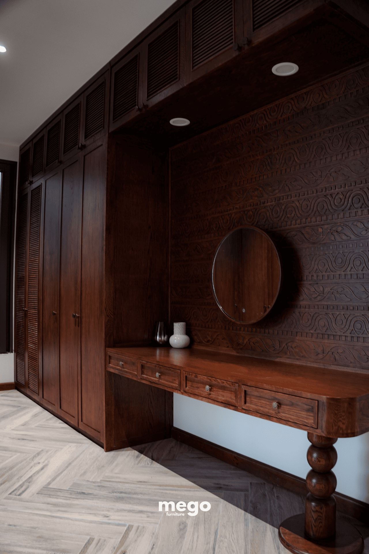 Phòng ngủ được đầu tư cả về công năng lẫn thẩm mỹ. Hệ tủ lớn được đo đạc chuẩn xác theo diện tích phòng, không âm tường nhưng thiết kế sát trần nên vẫn gọn gàng. Bàn trang điểm kết hợp gương tròn và họa tiết CNC thủ công làm điểm nhấn nhẹ nhàng nhưng tinh tế.