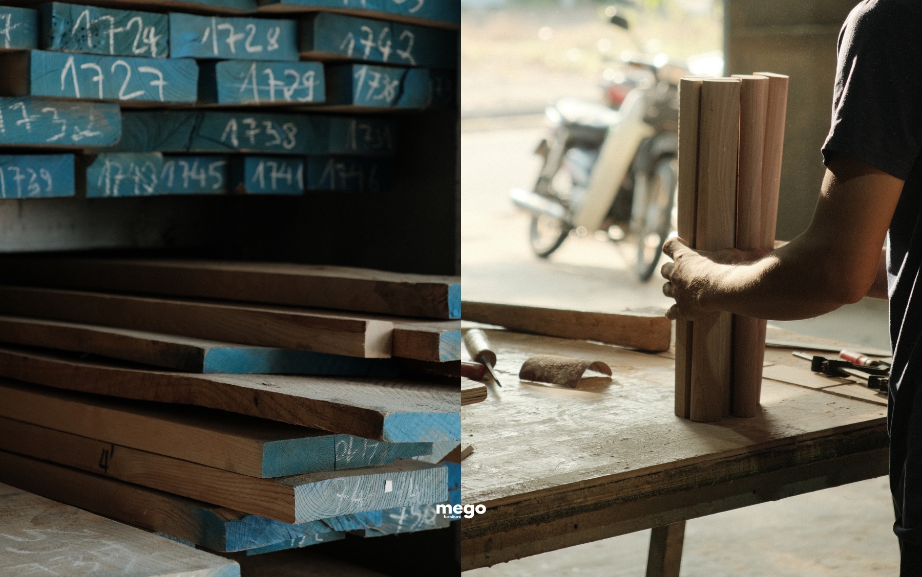 Lựa chọn gỗ đạt chuẩn: Ngay từ khâu nhập khẩu, gỗ đã được nhà cung cấp của Mego kiểm tra kỹ lưỡng về độ ẩm (đảm bảo đạt chuẩn 8-12%) và các yếu tố chất lượng như mắt gỗ, vết nứt tiềm ẩn, độ đồng đều của màu sắc và vân.