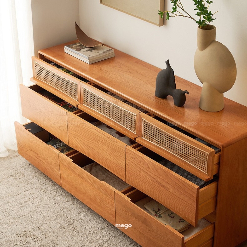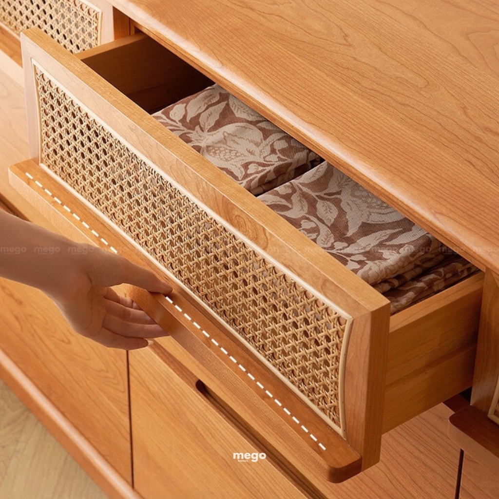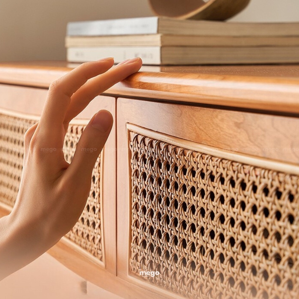 - Mặt hộc trên sử dụng chất liệu mây đan thủ công gần gũi; Hộc tủ dưới ngăn kéo tinh tế.
