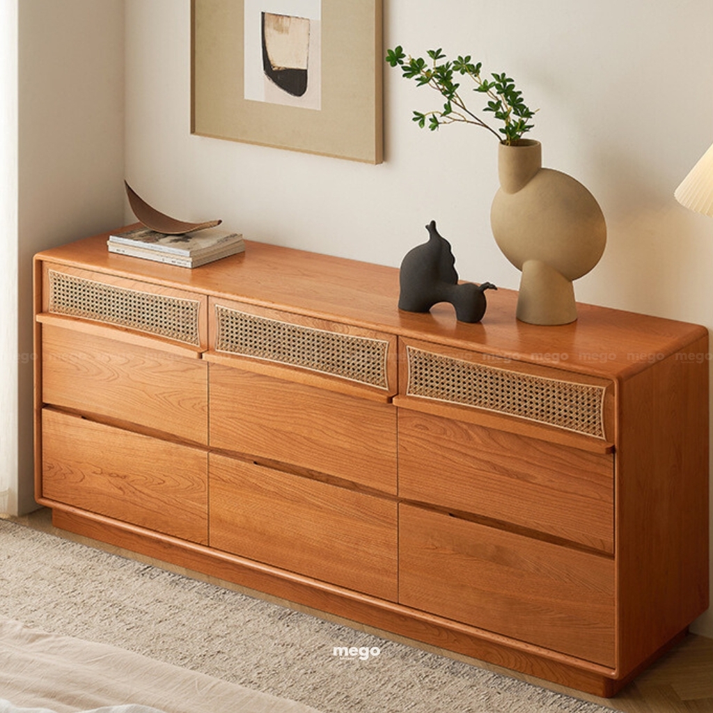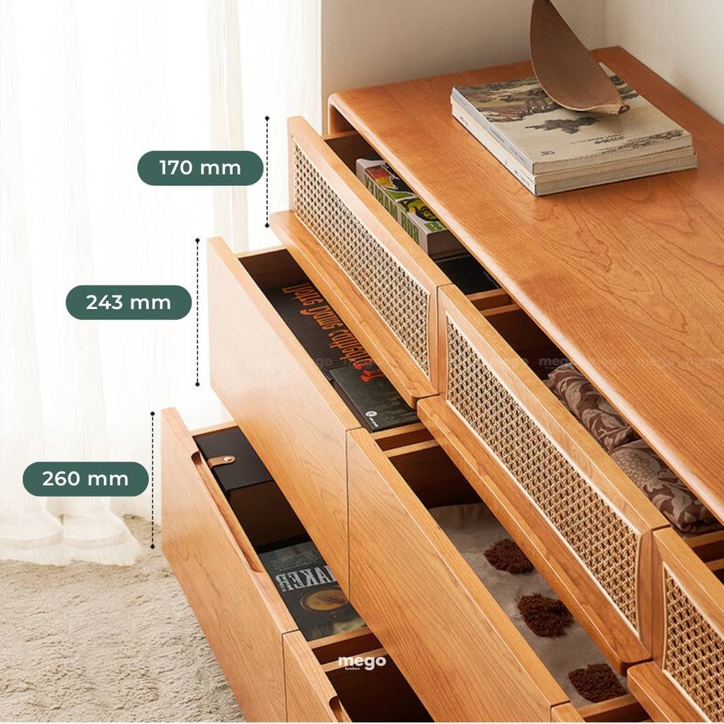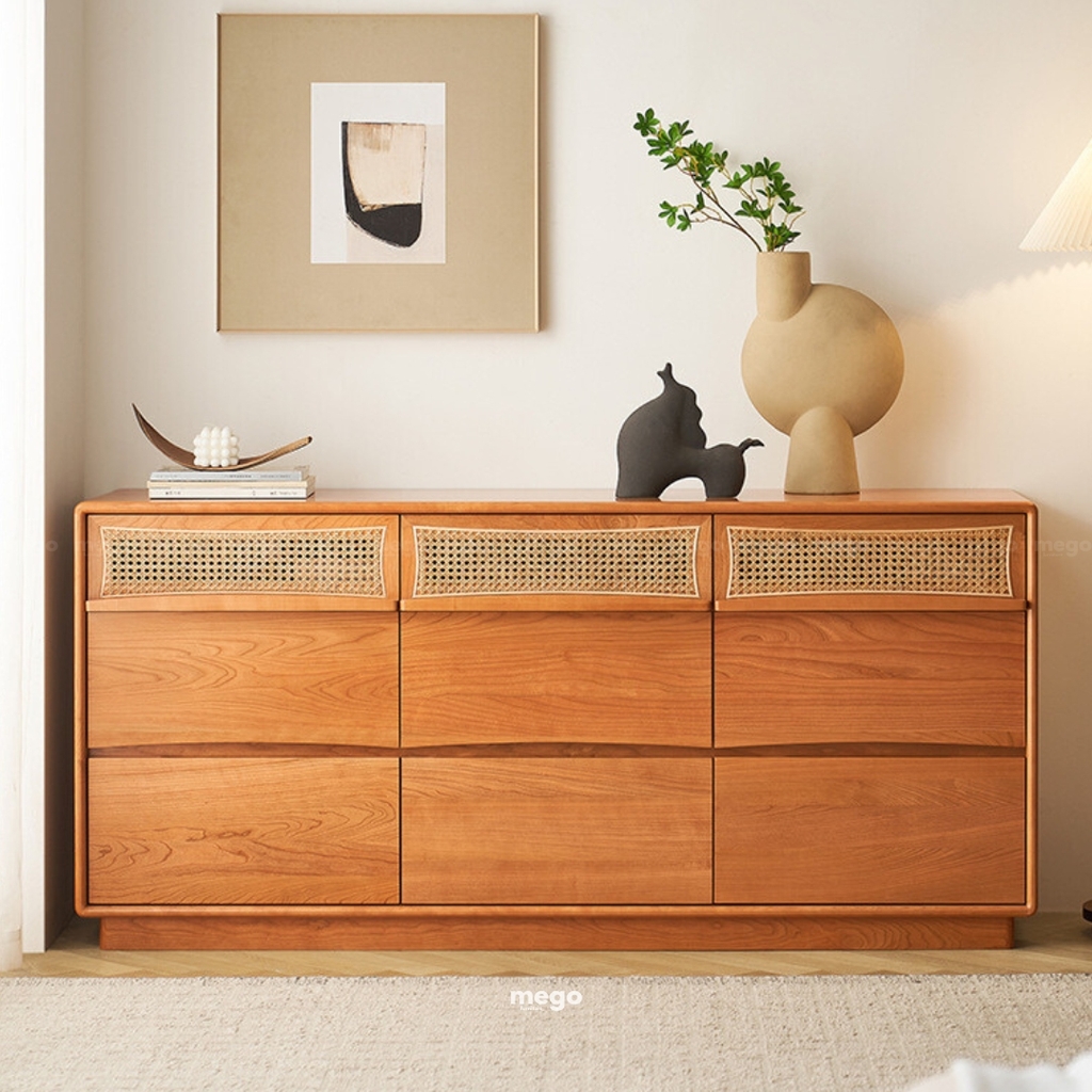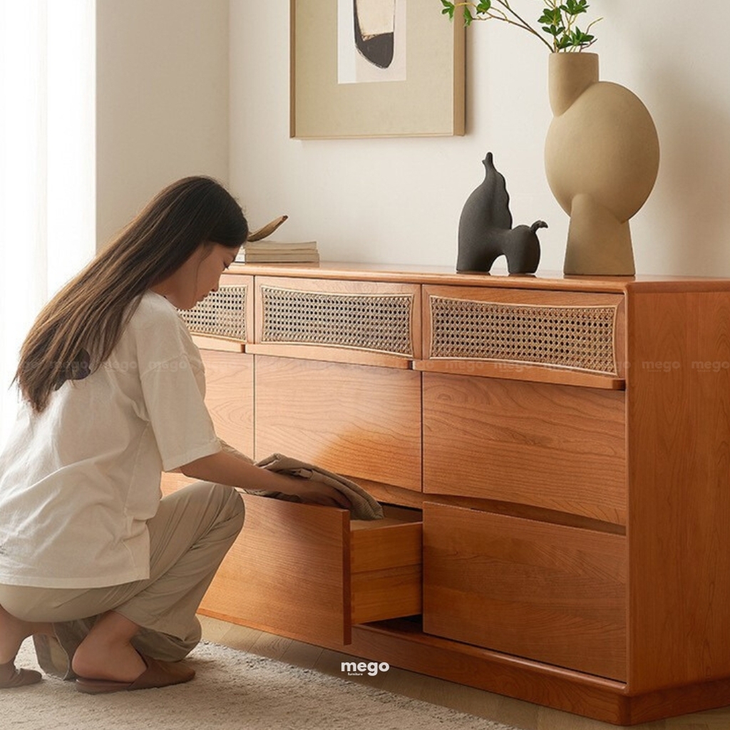 - Mặt hộc trên sử dụng chất liệu mây đan thủ công gần gũi; Hộc tủ dưới ngăn kéo tinh tế.