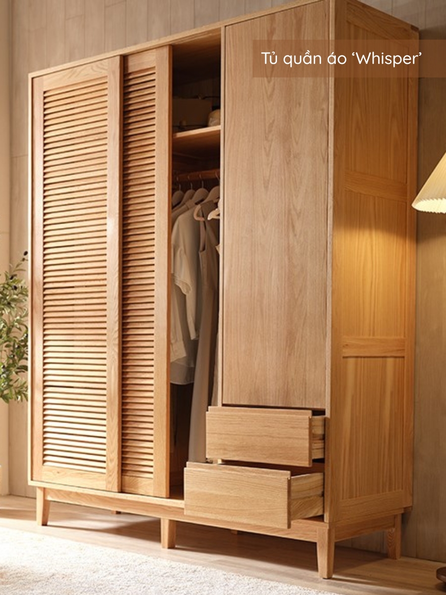 - Điểm đặc biệt: Cánh cửa lùa dạng lá sách độc đáo, giúp thông thoáng tủ, đồng thời tạo điểm nhấn thẩm mỹ ấn tượng. Bên trong bố trí khoa học với nhiều ngăn kệ và thanh treo đồ.