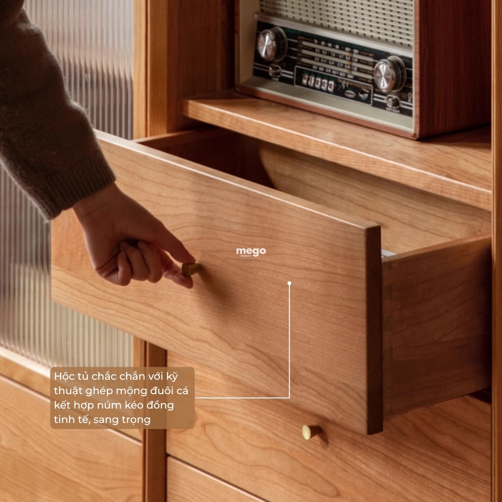 - Hộc tủ chắc chắn, tỉ mỉ với kĩ thuật ghép mộng đuôi cá tinh tế, sắc xảo kết hợp núm đồng sang trọng.