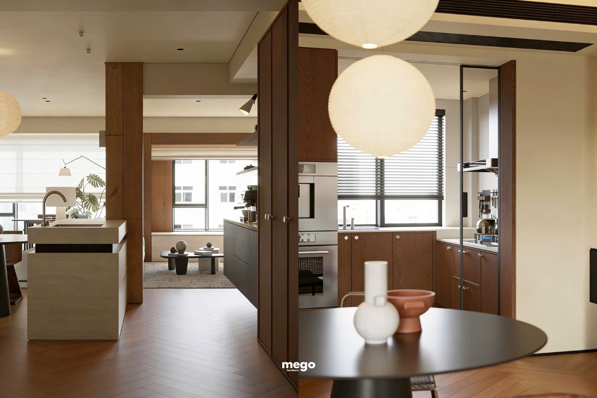 - Tập trung vào Chất liệu: Gia chủ thường đầu tư vào các vật liệu bền bỉ như Gỗ Tự nhiên (Sồi, Óc Chó) hoặc Gỗ Công nghiệp cao cấp phủ Veneer, Laminate (là thế mạnh của MEGO).
